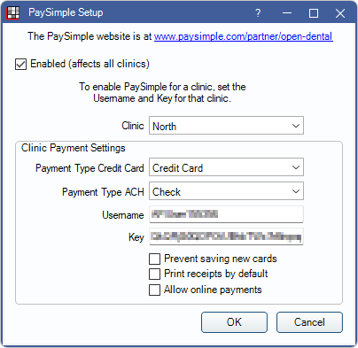 Enabled (affects all clinics) to enable PaySimple for all clinics. Unchecking disables PaySimple for all clinics. If the currently logged on user is restricted by clinic, only the clinic they have access to will show in the Clinic dropdown and they will not be allowed to uncheck the Enabled box.
