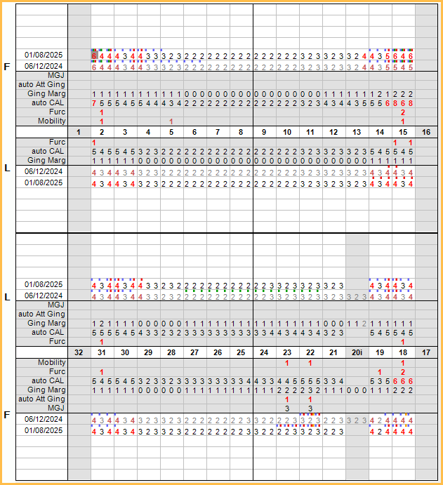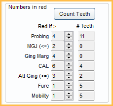 - For Probing, Ging Marg, CAL, Furc, and Mobility, measurements are flagged red when they are greater than or equal to the value.