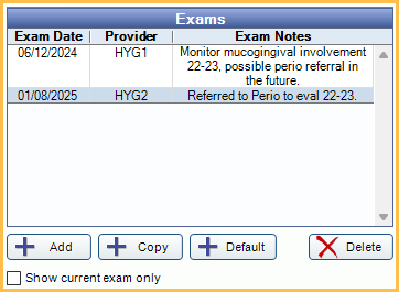 - Add: Create a new blank perio exam. A provider is automatically assigned to a new exam using the following logic: