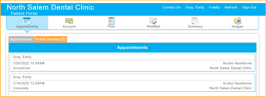 In the Appointments tab, patients can view scheduled and completed appointments and view other action needed items, such as appointments that need confirmed and Web Sched Recall notifications that are still unscheduled.