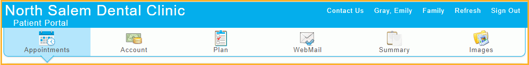 Patients can navigate Patient Portal by clicking the tabs at the top. Tabs can be included or omitted depending on the settings selected by the office in Patient Portal Settings.
