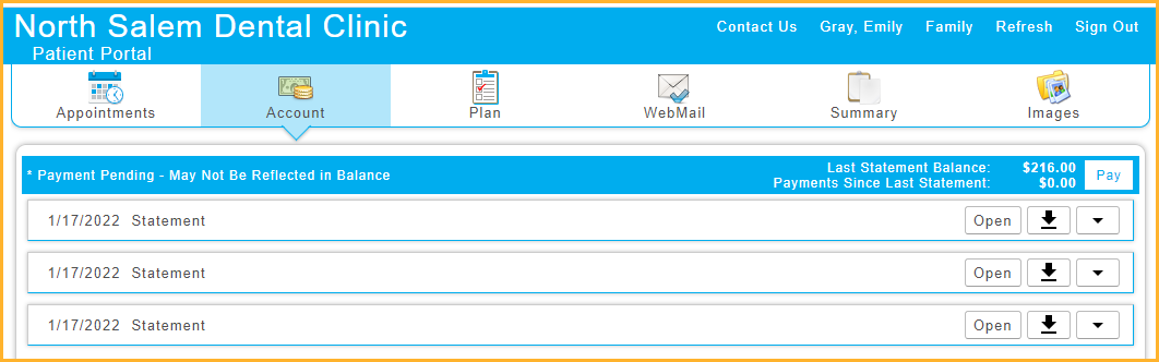 The balance is reflective of the last generated statement, not the current balance of the account. If a patient does not have a statement on their account, this area is blank.