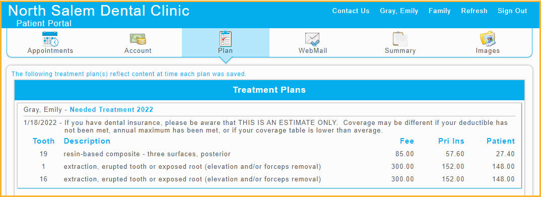 In the Plan tab, patients can view treatment planned procedures. This tab only displays treatment saved on a Saved Treatment Plan.