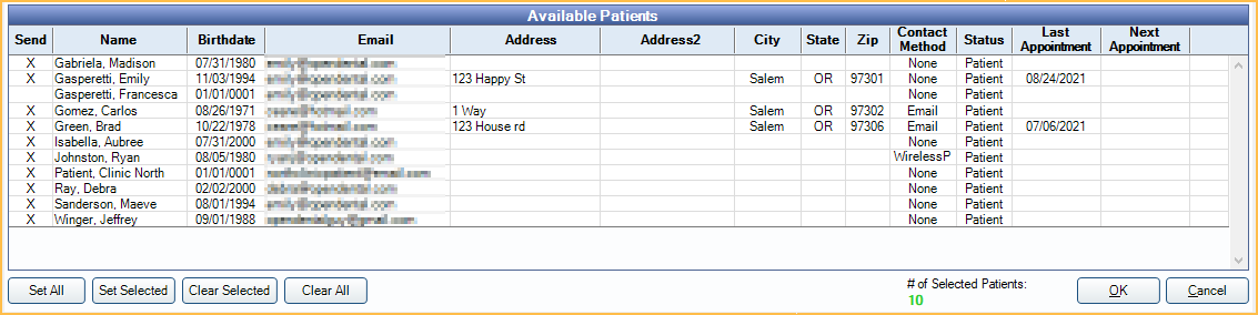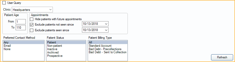 - The Advertising - Select Patients window will open. Use a query or the filters to generate a list of patients.
