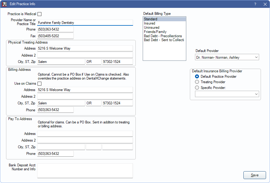 Enter the default practice address used on statements, sheets, etc., and the billing address and phone number used on claims. If using clinics, the clinic address and phone number overrides the practice address and phone. For more information on which address, and phone number is used on claims, see Claim Addresses.