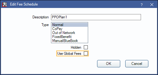 - Create one normal fee schedule (e.g., PPOPlan1) and disable Use Global Fees.