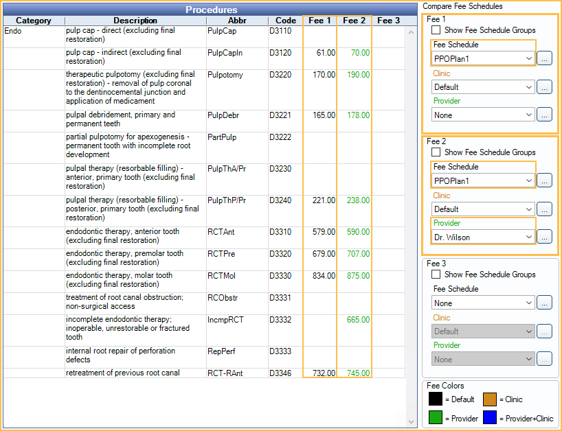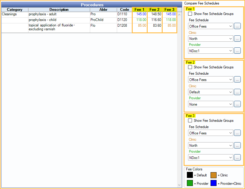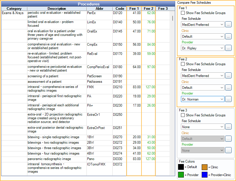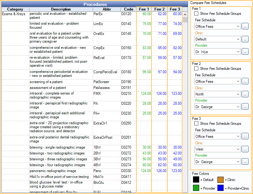 As the user selects criteria, the fees in the corresponding column will change to reflect the current fee entered for the fee schedule, clinic, and/or provider. The fee color is a quick method of identifying if a fee is global or specific. A color legend shows in the lower right. Customize colors in Definitions: Fee Colors.