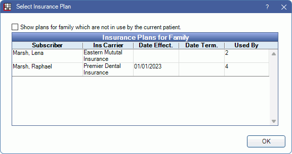 Link Existing Adj: Click to attach an existing adjustment to a completed procedure. Opens the Adjustment Picker window (see below). Adjustments not attached to a Paysplit, procedure, or Payment Plan are listed. Select an adjustment and click OK.