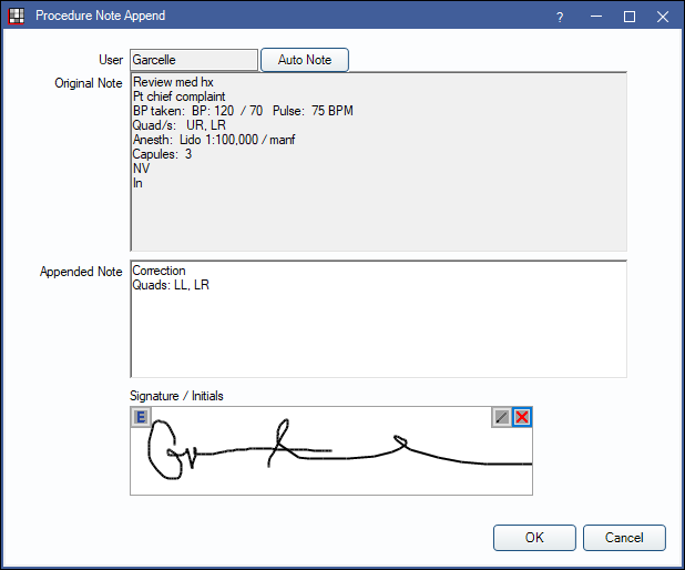 Enter the new note in the Appended Note text area, or add an Auto Note. Appended notes are dated, and appear in the Progress Notes below the procedure. Appended notes can be signed electronically; see Electronic Signatures. The user and signed status shown in progress notes is the user to last append the procedure. An Alert is generated when a note is appended by another user.