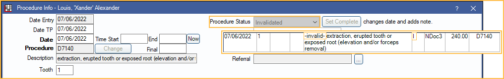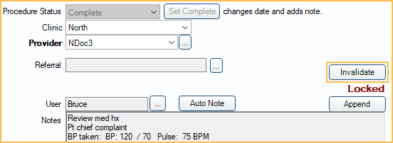 Locked procedures cannot be edited or deleted, only appended or invalidated. If a user made a mistake (e.g., the wrong procedure was set complete, or wrong treatment area entered), the procedure may need to be invalidated from the Edit Procedure window. If insurance claims, payments, or adjustments are attached to the procedure, these will need detached or deleted prior to invalidating the procedure.