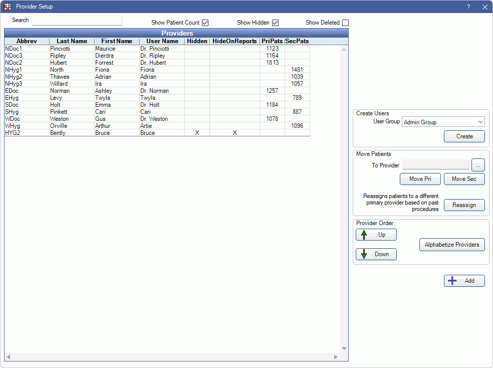 Show Patient Count: Check to view PriPats and SecPats columns. Counts the number of primary and secondary patients associated to a provider.