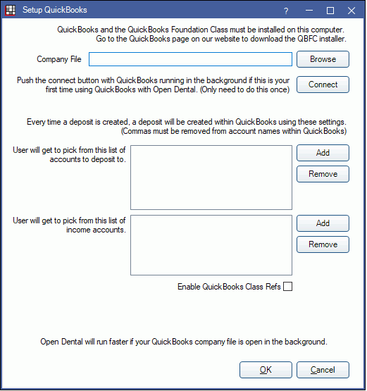 Multiple Open Dental Databases: One QuickBooks company file can have multiple Open Dental databases making deposits into it. Each Open Dental database will need to have the settings manually set up in order to start making deposits into the company file. Be sure to make a detailed memo if users need to know which database the deposit came from.