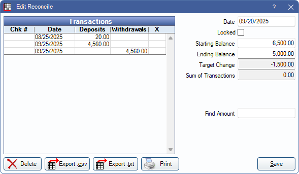 Locked: Check to prevent users from editing the reconcile entry once the reconcile is complete. The reconcile can only be locked if the Target Change value and the Sum of Transactions match.