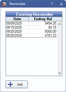 Click Add to start a new reconcile. The Edit Reconcile window will open and list transactions not yet reconciled.