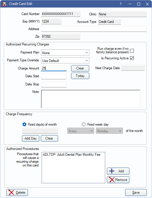 To edit recurring charges, double-click the credit card and update any of the information as needed (e.g., charge amount, frequency, etc). Click Save to keep changes. If the card has already been charged for the current month, update the Date Start to the next expected charge date to prevent additional charges for the current month.