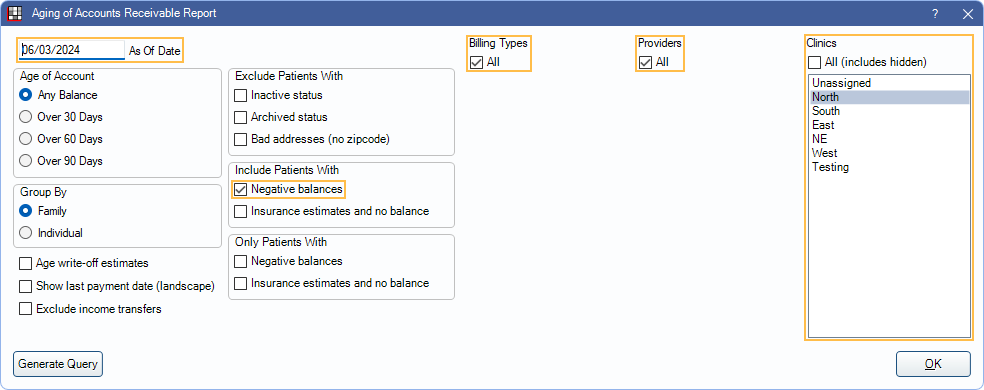 - When grouped by family, the report includes patients with negative balances and insurance estimates by default.