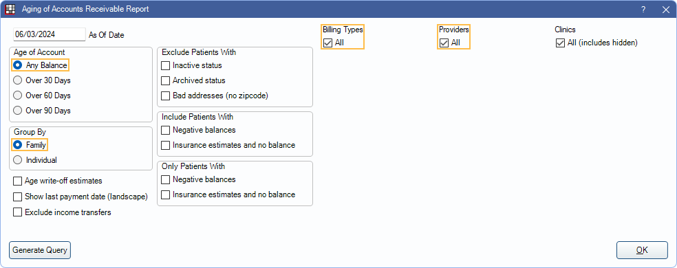Include Patients With: Include patients that meet the selected criteria. Check to enable; uncheck to disable. When grouping by Family this is based on the total family balance.
