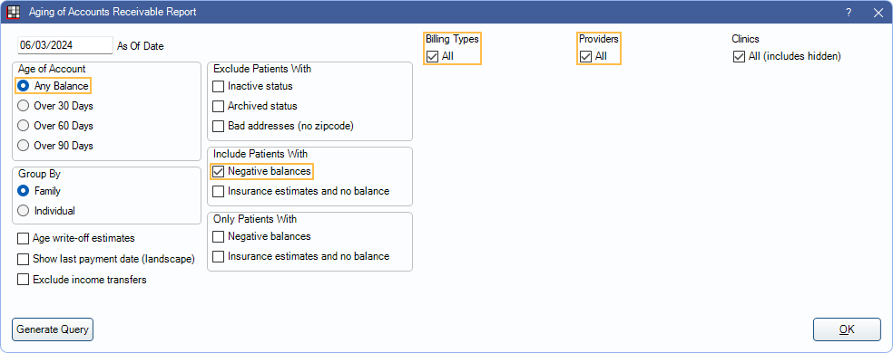 - If some clinics have been hidden, checking All (includes hidden), includes patients attached to hidden clinics. Running the report for each clinic separately may exclude some A/R if it is attached to patients assigned a hidden clinic.