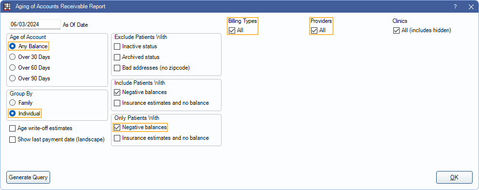 - Negative balances: Only show patients who have a negative balance (i.e., credit).