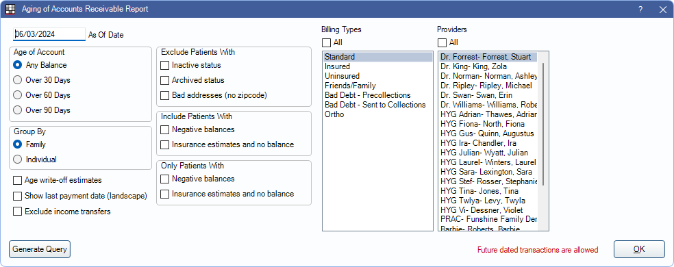 - When Group By is set to Family, filters by guarantor's Billing Type.