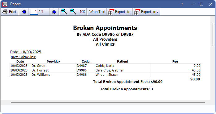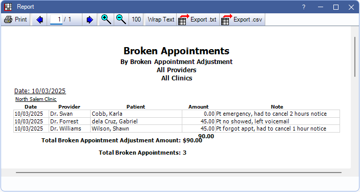 The Total Broken Appointment Adjustment Amount and Total Broken Appointments are included on the last page of the report in bold. If using clinics, these are the totals for all clinics included in the report.