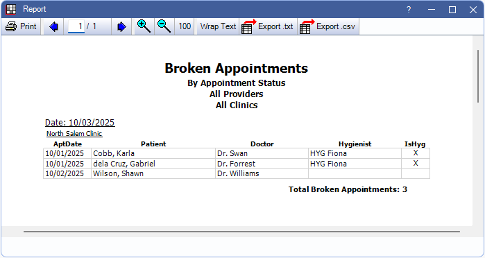 Click OK to generate a print preview the report. The report differs based on the broken appointment method selected. Results for all report types are grouped by clinic if applicable.