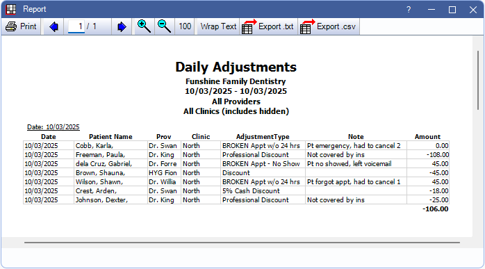 Use the Daily Adjustments Report to see adjustments for a date range, filtered by provider, clinic, or adjustment type.