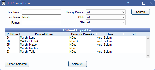 Highlight patients whose records are to be exported or click Select All to highlight all patients in the list.