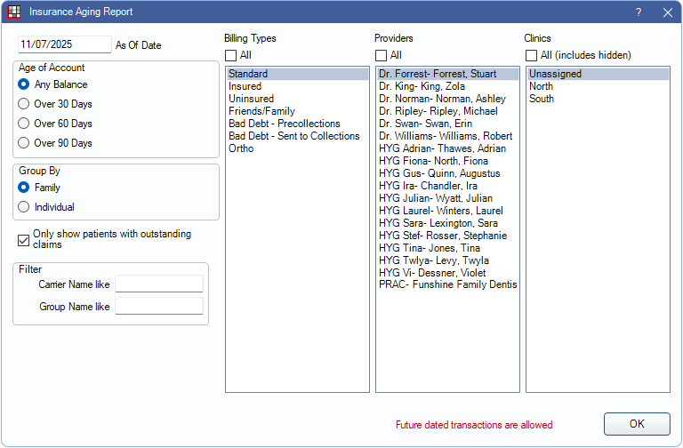 - Checked: Limit report to patients with outstanding claims and enable insurance breakdown options below. Results are grouped by both carrier name and group name.