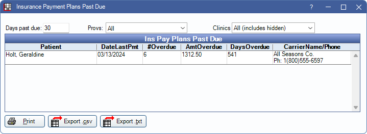 The Insurance Payment Plans Past Due Report lists patients with overdue balances on an Insurance Payment Plans. Insurance payment plan past due amounts do not show in the Payment Plans grid of the Account Module.