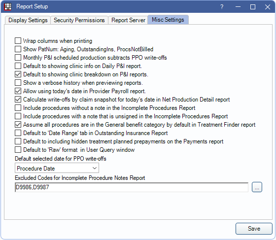 Excluded Codes for Incomplete Procedure Notes Report: Determine which codes to exclude from the Incomplete Procedure Notes report. D9986 ( Missed) and D9987 (Cancelled) are entered by default. Click [...] to select additional codes.
