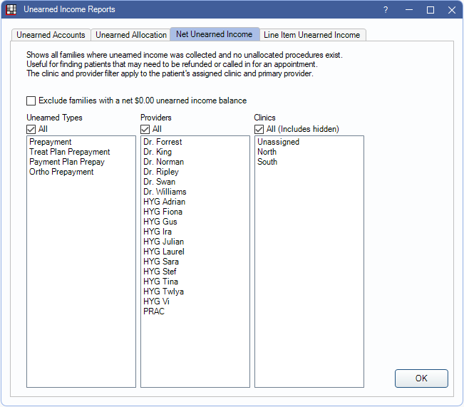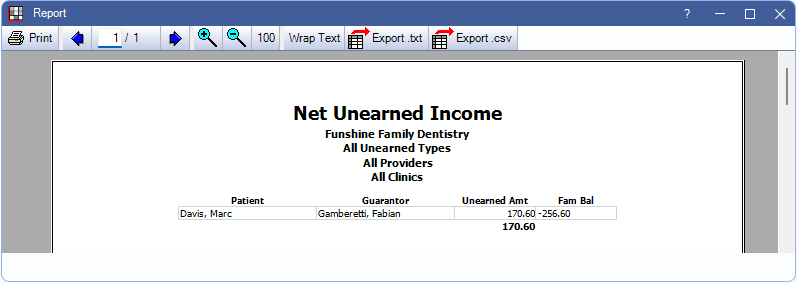 The Net Unearned Income Report shows families with patients that have unearned income payments collected and no unallocated procedures.