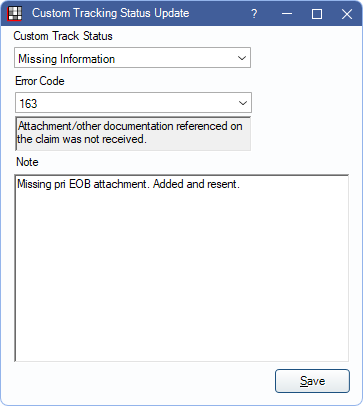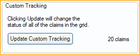 Use this tool to change the Track Status or Error Code of all claims and preauthorizations currently in the grid. Only enabled for users with the Update Custom Tracking security permission. See Definitions: Claim Custom Tracking for additional information.