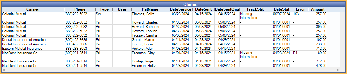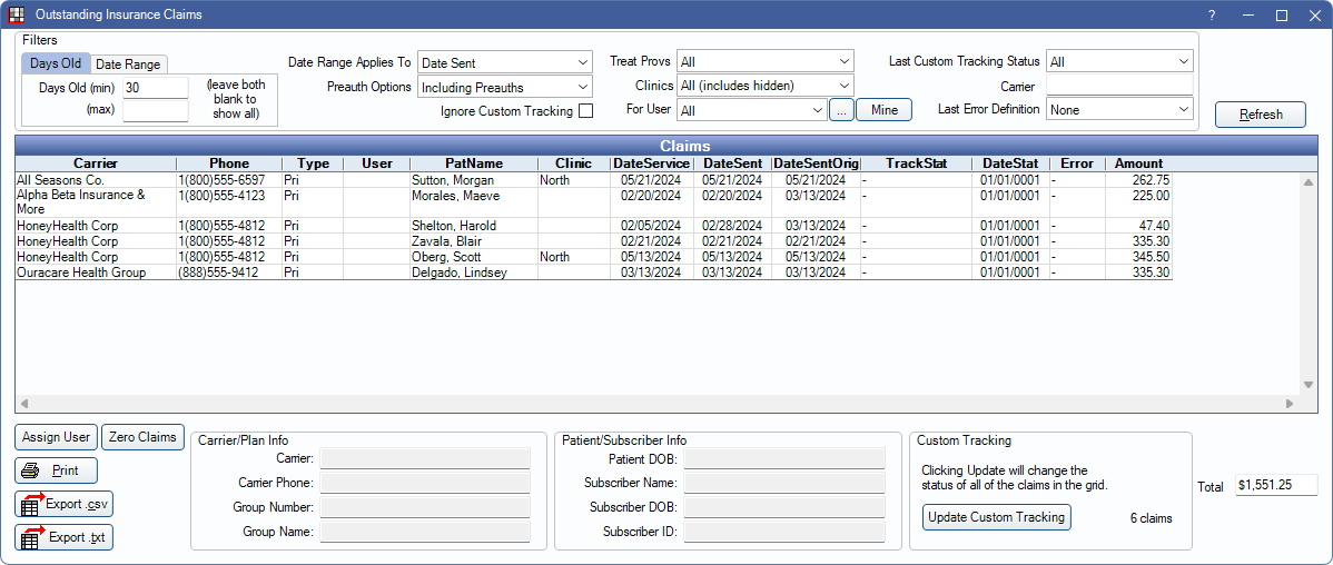 This report is useful for tracking claims and preauthorizations that have been sent, but not received. From here users can also update tracking status for many claims and preauthorizations at once or delegate staff to follow-up on claims.