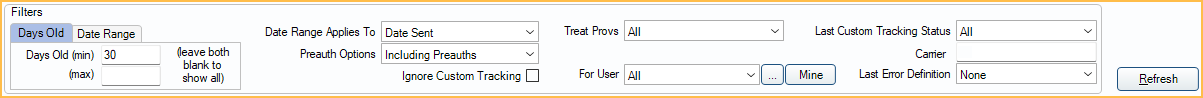 - Days Old (min/max): Filter by claim age. The age of the claim depends on the date type selected in the Date Range Applied to filter. Leave both fields blank to show all claims.