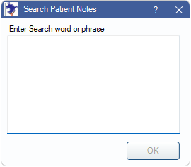 Enter a Search word or phrase: Type the word or phrase to search in the patient note fields (i.e., Address and Phone Notes, Fam Urgent Fin Note, Med Urgent Note, and Appointments Module Notes for specific text.)