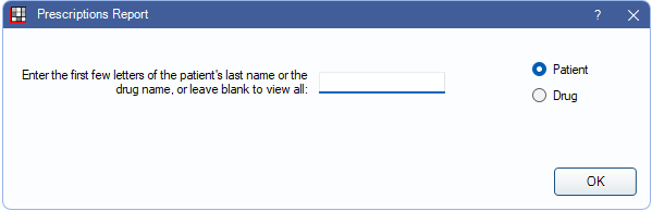 Enter the first few letters of the patient's last name or the drug name: Leave blank to show all prescriptions. Type a patient last name or drug name to filter the report.
