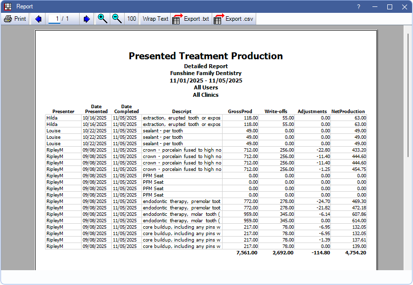 The Presented Treatment Production Report totals the production from completed procedures that are attached to Saved Treatment Plans.