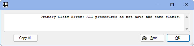 Automatically Group Procedures: When checked, if selected procedures include same patient with different clinics or places of service, separate claims are created for each Clinic/place of service when clicking Create Claims. When unchecked, users are blocked from creating claims when patient procedures have different clinic/place of service; users must select the procedures from the same clinic/place of service only to create claims.