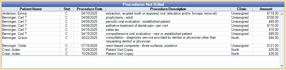 All procedures on this list should either be billed to insurance or marked Do Not Bill to Ins in the Procedure Info window. Procedures only appear if the procedure has a fee and the patient has an active insurance plan.