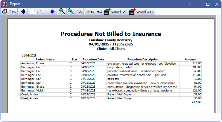 The Procedures Not Billed to Insurance report generates a list of procedures with an outstanding insurance estimate that have not been attached to a claim.
