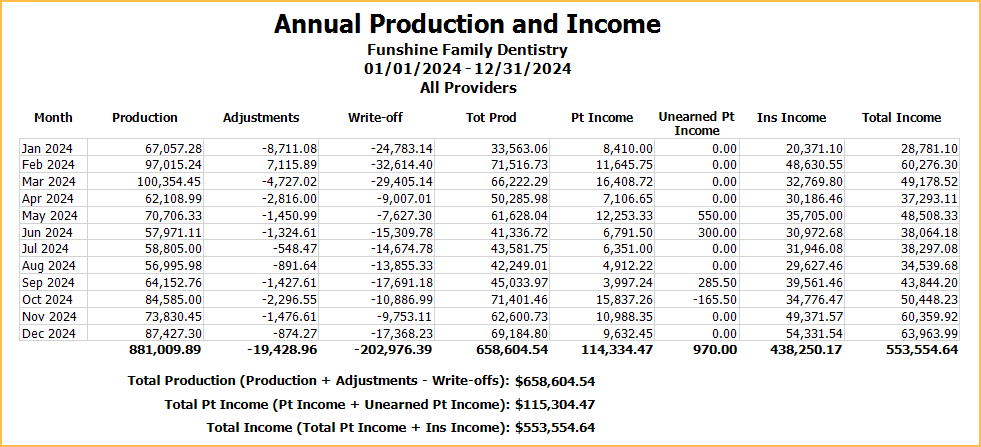 The Annual Report Type sums up all production and income for the selected date range, provider(s), and clinic(s) and groups the totals by month.