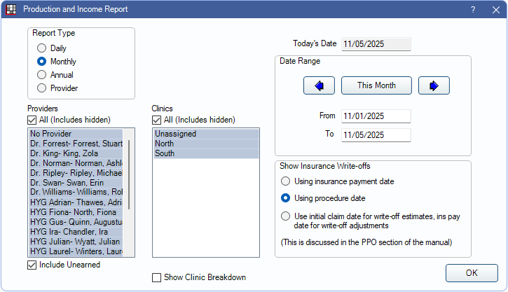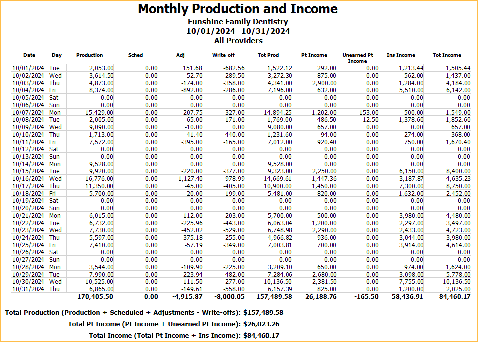 The Monthly Report Type sums up all production and income for the selected date range, provider(s), and clinic(s) and groups the totals by day. To show itemized history for a monthly date range instead, run the Daily Report Type and enter a date range for the desired month.