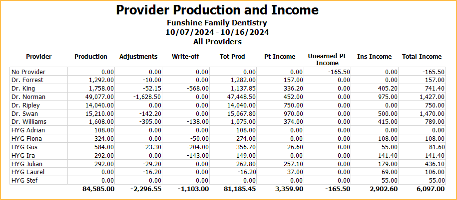 The Provider Report Type sums up all production and income for the selected date range, provider(s), and clinic(s) and groups the totals by provider.