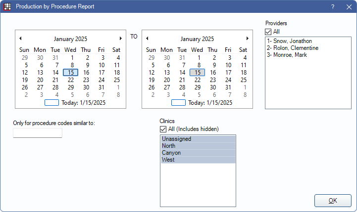 - Enter a complete procedure code (e.g., D1234) to limit the report to a single procedure code.