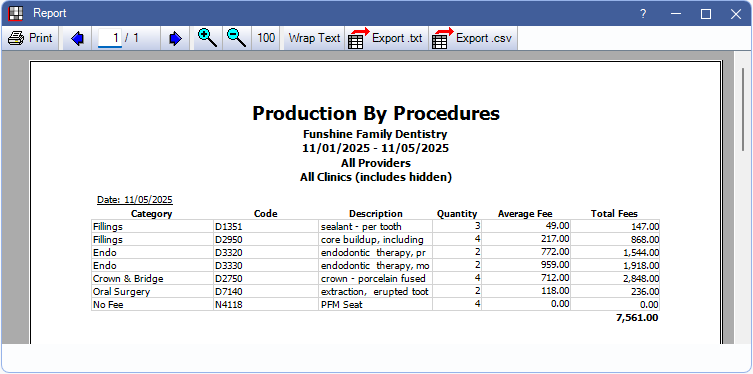Run the Production by Procedure report to display details about procedures completed in a date range by procedure code.