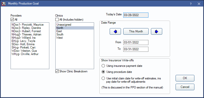 - Scheduled: Production in scheduled appointments. Procedures must be attached to appointments to calculate.