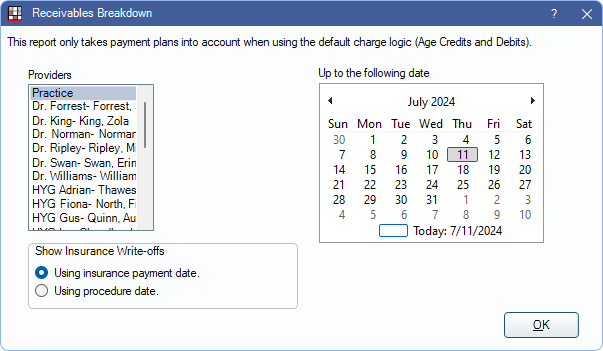 - Show Insurance Write-offs: Select Using insurance payment date.