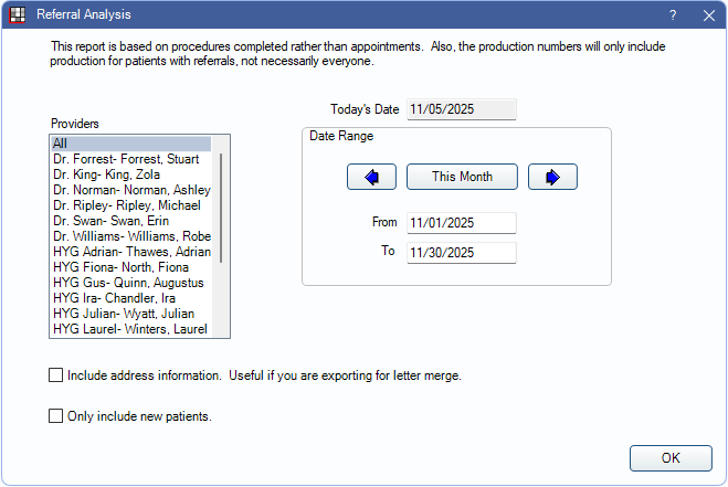 Only include new patients: Check this box to only include new patients in the analysis. Patients will appear on the report if they had their first procedure completed by a selected provider in the date range. This may differ from the New Patients Report.