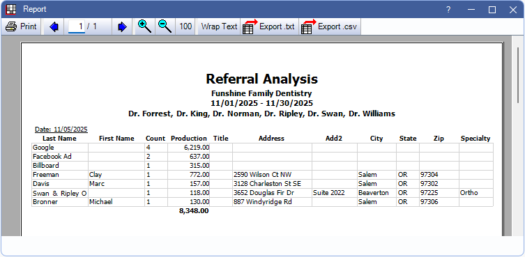 Patients must have a Referred From entered in the Family Module to be included in the report. See Referrals.